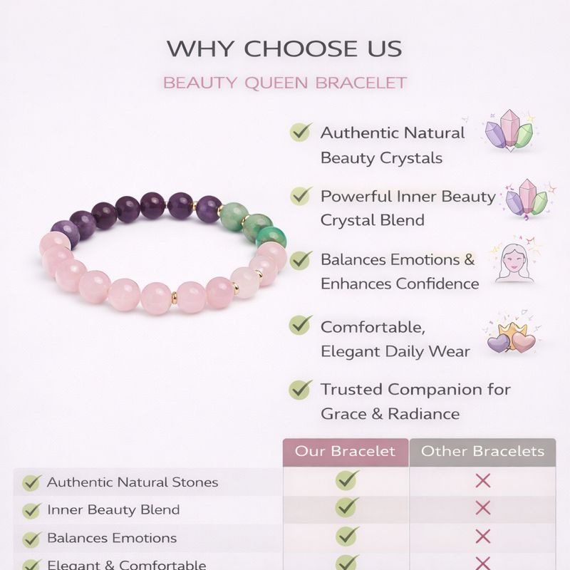 The Beauty Queen Bracelet is thoughtfully designed for women who wish to enhance their inner beauty, emotional confidence, and natural radiance. True beauty begins with emotional balance, self-acceptance, and inner peace—factors often affected by stress, emotional sensitivity, and lifestyle pressures.