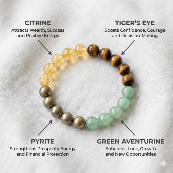 This bracelet combines Citrine, Tiger Eye, Pyrite, and Green Aventurine, creating a balanced synergy of abundance, confidence, protection, and opportunity attraction. Each crystal plays a specific role—together they help align effort with opportunity and mindset with success.