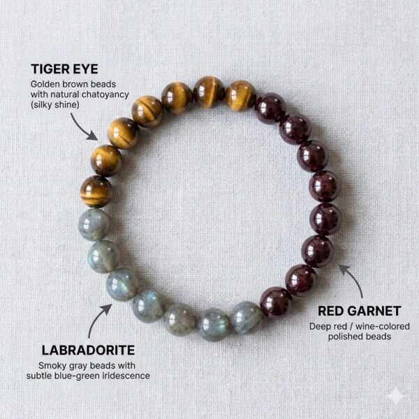 This bracelet combines Tiger Eye, Red Garnet, and Labradorite, crystals known for grounding energy, perseverance, focus, and practical strength. Together, they help stabilize scattered energy and support steady progress.