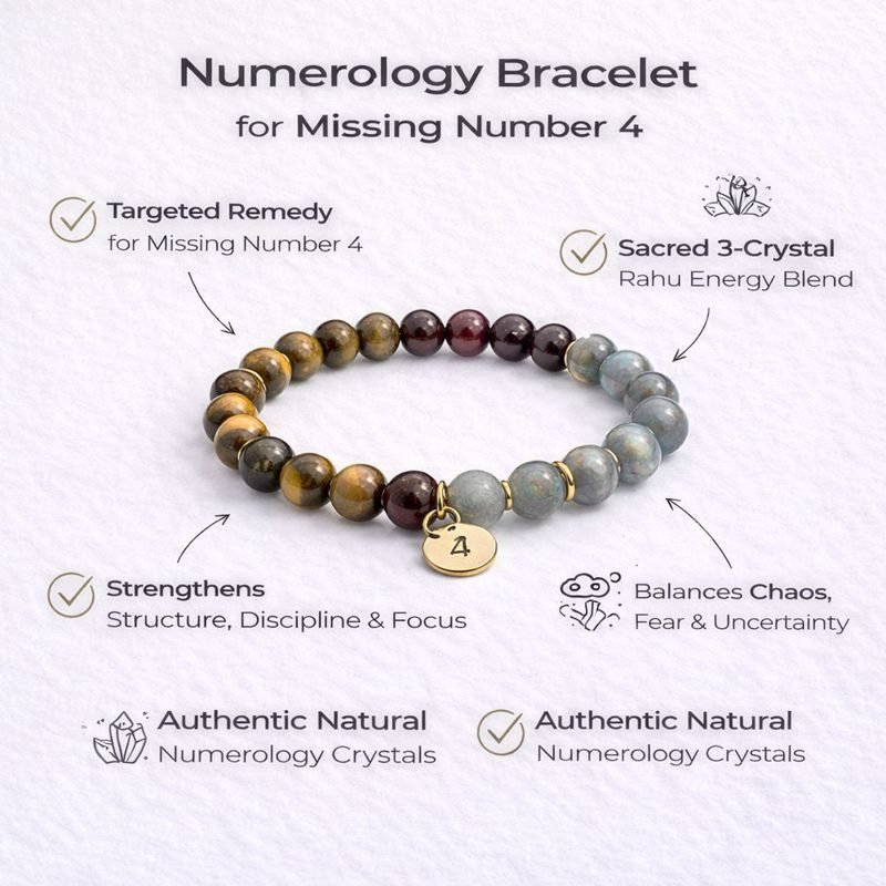 The Numerology Bracelet for Missing Number 4 is created for individuals whose numerology chart lacks the vibration of Number 4. When this number is missing or weak, it often reflects as lack of stability, difficulty maintaining discipline, inconsistent effort, or challenges in building long-term foundations.