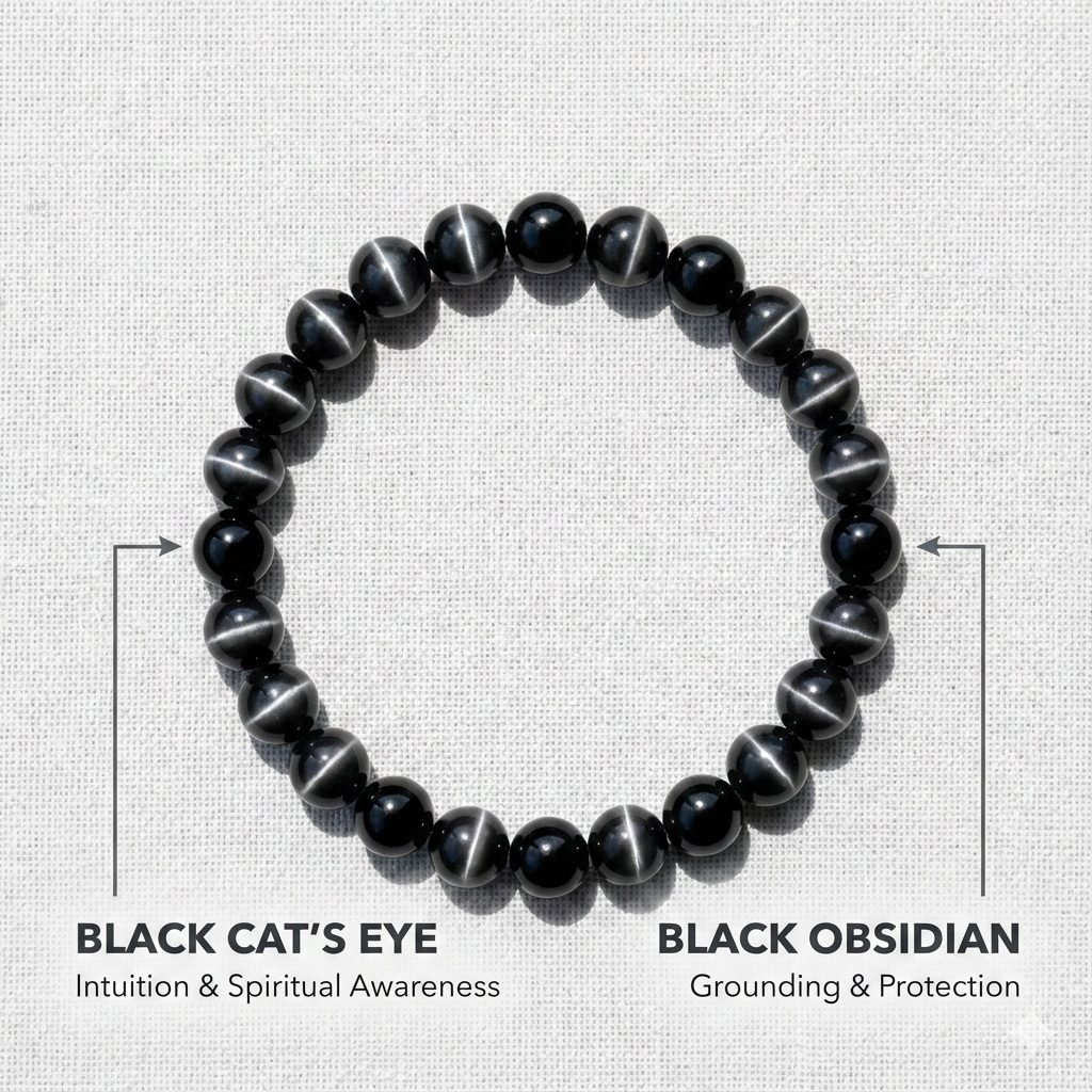 This bracelet combines Black Cat’s Eye and Black Obsidian, both known for strong grounding and protective properties. Together, they help stabilize mental energy, strengthen intuition, and protect against emotional and energetic disturbances.