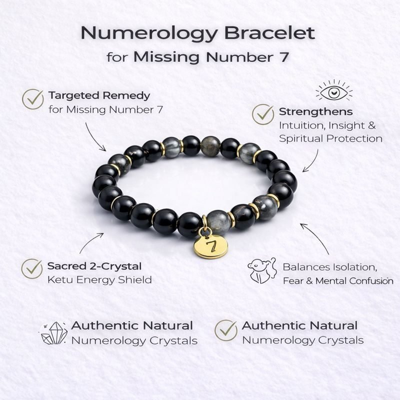 The Numerology Bracelet for Missing Number 7 is created for individuals whose numerology chart lacks the vibration of Number 7. When this energy is missing or weak, it often appears as lack of intuition, inner confusion, difficulty trusting inner guidance, or vulnerability to negative influences.