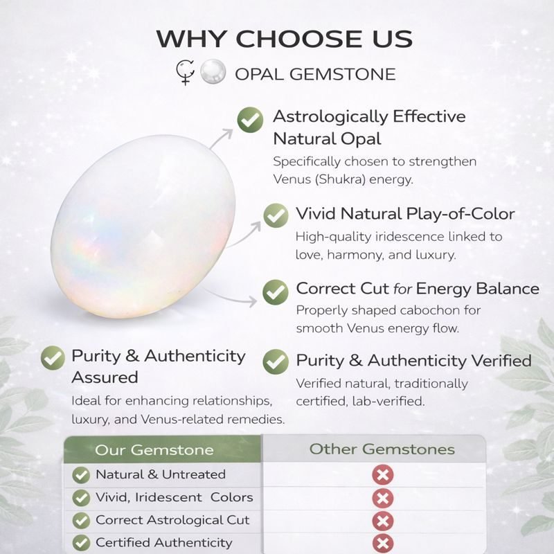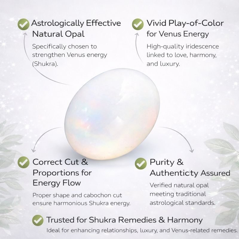 Opal is considered an upratna (substitute gemstone) for Venus, the planet governing relationships, love, creativity, luxury, emotional satisfaction, and harmony. It is often recommended when Diamond is unsuitable due to budget, health, or horoscope conditions.